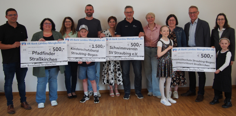 Mitglieder des Basarteams übergaben insgesamt 3000 Euro Spenden aus den Erlösen von Frühjahrs- und Herbst-Basaren der letzten Jahre an Vereine und Einrichtungen zur Unterstützung von vorbildlicher Bildungs- und Jugendarbeit. Nur mit Hilfe vieler freiwilliger Helferinnen und Helfer, aufgrund einer logistischen Meisterleistung und letztlich großem ehrenamtlichen Engagement sind diese finanziellen Zuwendungen des Basarteams an die gemeinnützigen Institutionen möglich. Im Bild zu sehen sind Vertreter der Vereine mit Mitgliedern des Basarteams Straßkirchen.